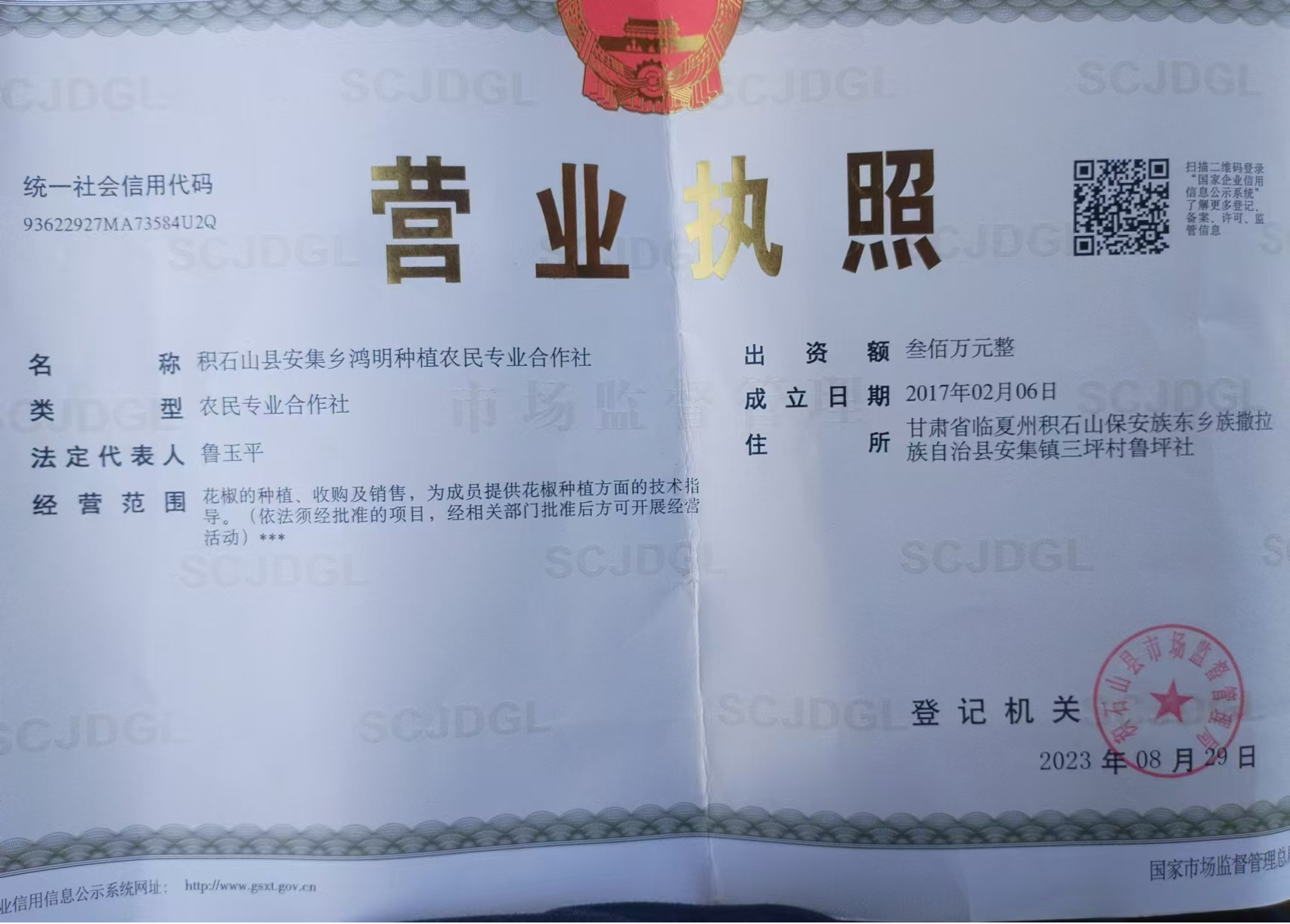 积石山县安集乡鸿明种植农民专业合作社成立于2017年2月,注册资金300万元。现有成员30人、种植花椒800亩,年产花椒6吨,合作社年收购花椒花椒230吨销售200吨。