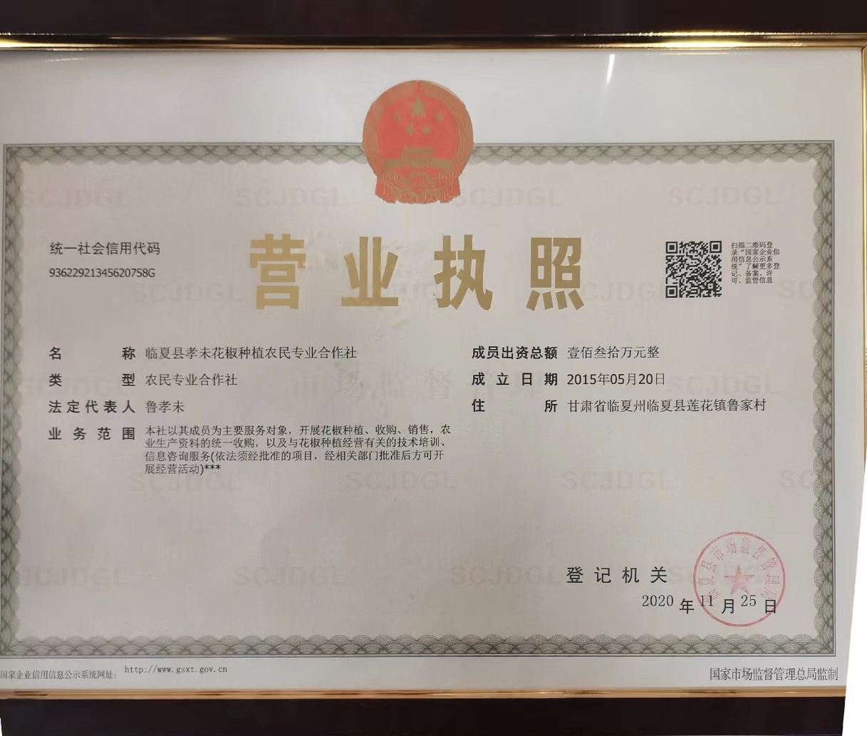 临夏县孝未花椒种植农民专业合作社成立于2015年5月,注册资金130万元,股东数5名。种植花椒100亩,每年收入花椒5000斤,收购加工25万斤,储存5万斤。农民合作社以其成员为主要服务对象,开展无公害花椒的种植、收购、销售、包装以及与无公害花椒种植有关的技术培训、信息咨询服务、村民自愿参社。合作社有筛椒机4台,色椒机1台,烘干机1台,库房4000平方米。