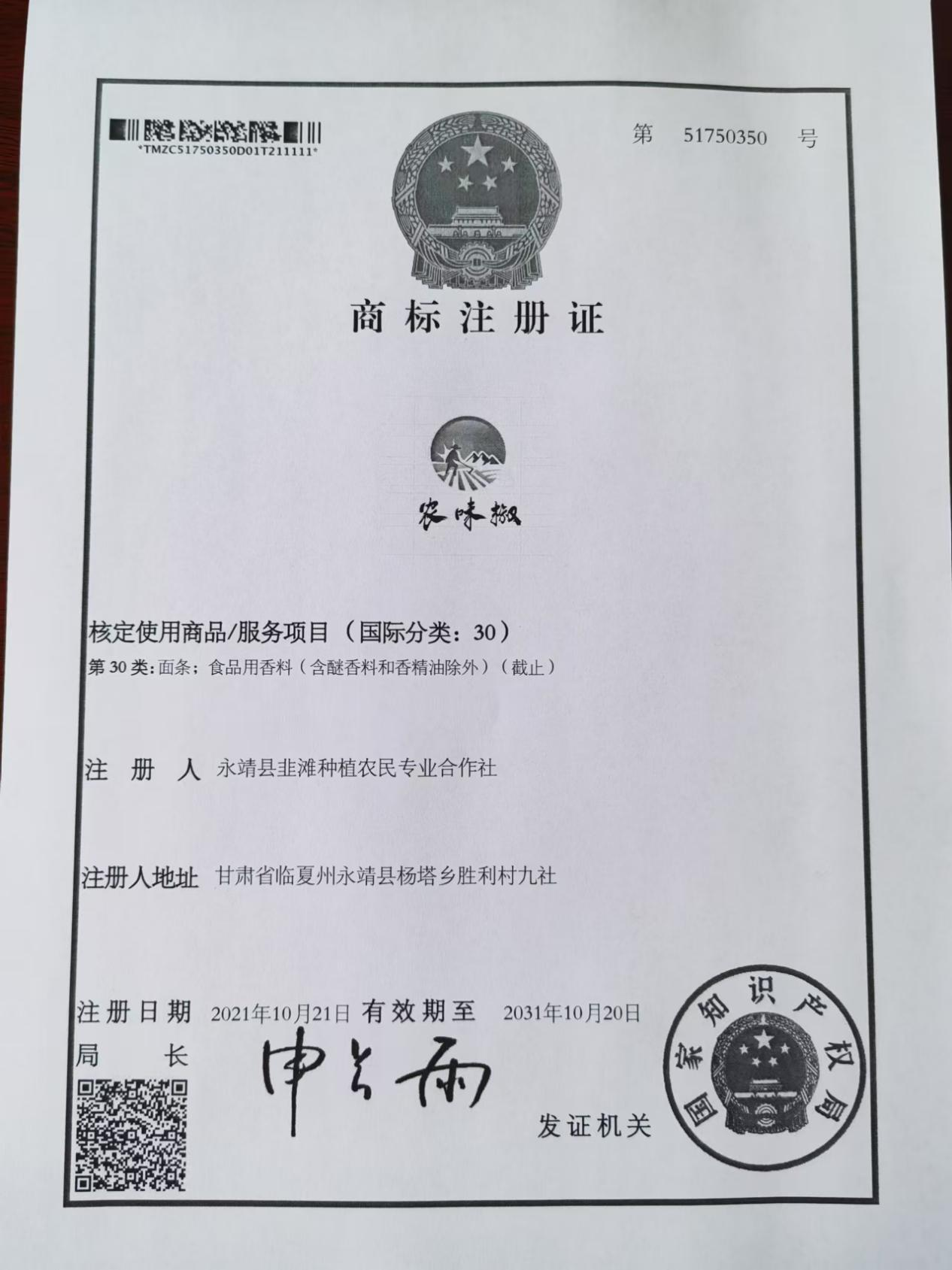 永靖县韭滩种植农民专业合作社成立于2017年7月21日,现有社员5人,注册资金600万元,主要业务范围为蔬菜、水果、粮食作物种植、苗木培育、销售、花椒、黄芪包销售、水果采摘等业务。现自有商标“农味椒”,核定使用品类为香料。 永靖县韭滩种植农民专业合作社种植面积大概300余亩,带动25户农户销售花椒,合作社务工18人,花椒年销售额1万多斤。合作社加工花椒厂房面积200平方米,现有加工设备3台,花椒去籽机一台,筛选机一台,包装机一台。